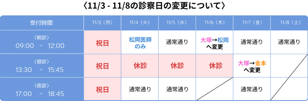 11月の休診・代診のお知らせ